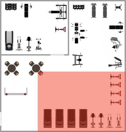 我们提供一体化的健身房解决方案,以专业的角度提供最合理的空间布局。2D图纸:传统的设计图纸,展示健身房的布局和设备摆放,门框、窗户、墙体和电源插座等精准细节。3D图纸:专业的设计布局,